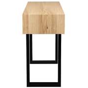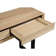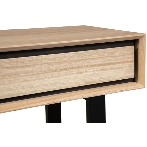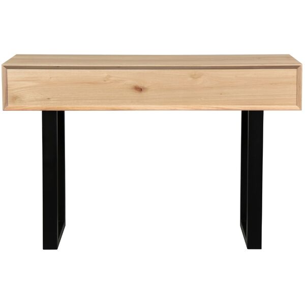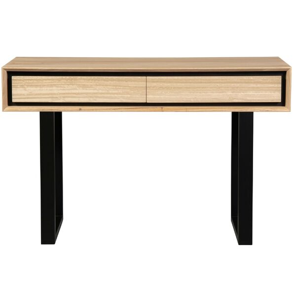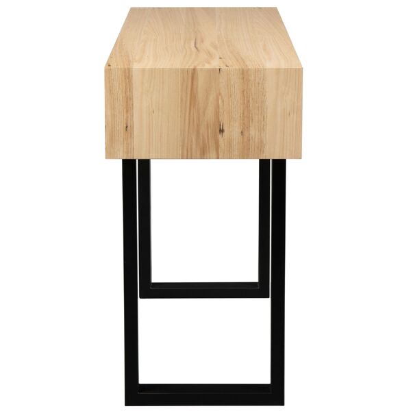 Add the value of convenience to your living room with this sleek console table with storage space. The table has 2 drawers with full extension metal runners. The unique furniture piece is made of sustainably harvested, MDF, Solid and Veneer Messmate, Solid Rubber, and Kiri Wood. The combination makes it super strong, and durable. All drawer fronts are made from solid messmate. The drawer boxes are made from Kiri wood with a finger joint construction and a messmate veneer base. Both drawers have integrated handles for a clean seamless look. Black shadow gap around the drawers add to the table's beauty. Painted in a natural PU finish, the console table is paired with black powder coated metal leg frame. The elegant table has a one-of-a-kind design with top and legs in different colours and styles. A one-year warranty is included with easy-to-assemble console table.