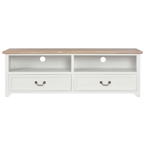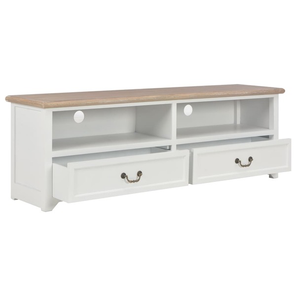 Featuring a trendy yet practical design, this TV cabinet will definitely become a focal point of your room. This modern wooden TV cabinet, made of MDF, solid pine wood and a unique paulownia veneer, will make a timeless addition to your home. It has 2 drawers for storing knick-knacks and 2 open compartments for keeping multimedia appliances, gaming consoles and magazines.