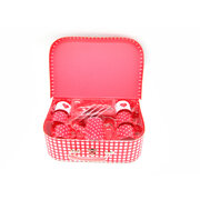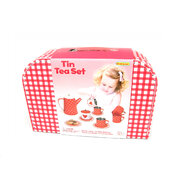 A heart pattern tin tea set in a suitcase . A wonderfully nostalgic tea set in a strong stitched cardboard case. This set has four place settings with sugar bowl, milk jug and a tea pot. The saucers can be place under the mug or can be used as a side plate. A perfect set for afternoon tea party. Roleplay gives kids opportunities to improve social skills. Very well made set.