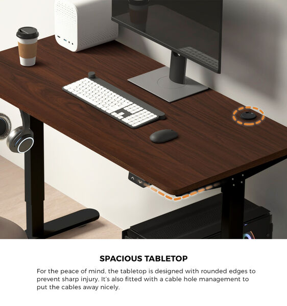 The spacious desktop is designed to match the frame perfectly with all installation holes pre-drilled and factory-aligned for an easy fit. Plus, the 25mm thick desktop is made of eco-friendly and non-toxic particle board and given an anti-scratch matt finish that feels absolutely smooth and easy to clean and maintain. The rounded corners ensure no nasty bumps and safe working conditions all around.