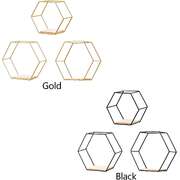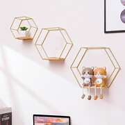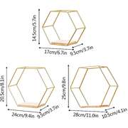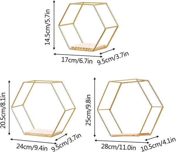Featrues1. Hexagon Floating Shelves: Make good use of the empty place and create a warm home-style space place to display your photo, books, and organizes, while holding collectibles, small plants, trophy, and more.2. Perfect Design: Style your wall like a professional magazine shoot. Show off your prized possessions in modern hexagon wall shelves. The floating design provides a seamless look for any room. The perfect plant wall shelf or collectible display. Use multiple sets to make eye-catching patterns.3. Super Easy Installation: No assembly required! The iron frame is integrated. Each hexagon shelf is made from sustainable wood.4. Quality Material: Floating Shelf is made of high-quality wood and iron. Both of the materials are durable and sturdy. Can be used for a long time.5. Satisfactory Service: If you have any questions about this project, please feel free to connect us. We will do our best to provide you with a pleasant shopping experience.SpecificationMaterial: Iron+WoodColor: GoldenSize: S: 17×14.5×9.5cm, M: 24×20.5×9.5cm, L: 28×25×10.5cmPackage Include:3 × Floating ShelvesPackage Including Package Include:3 × Floating Shelves