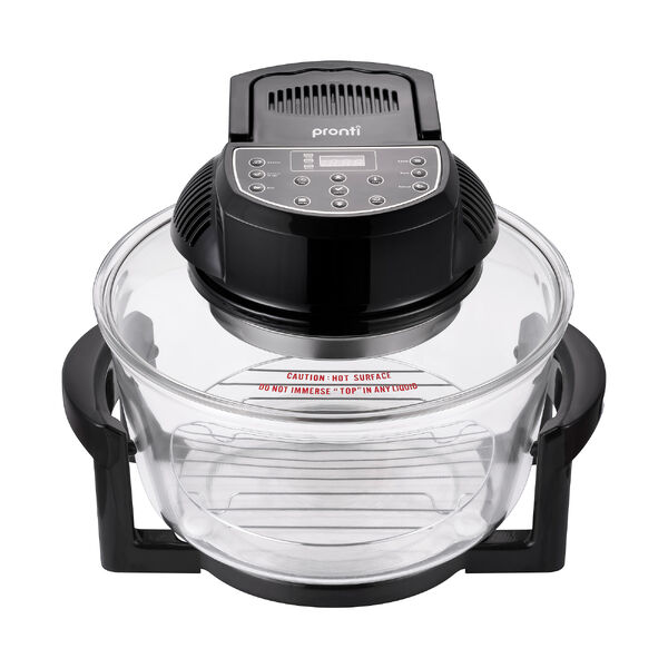 This convection oven is all about speed without sacrificing taste. With its LCD display and precise time and temperature control, youll nail every dish you put out. Say goodbye to soot and hello to healthy, oil and fat-free meals with the Pronti convection oven!
