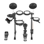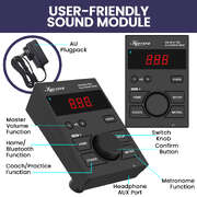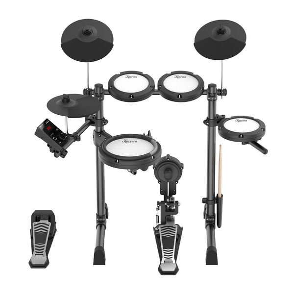 - Includes everything a beginner needs: drum module, mesh pads, kick and hi-hat pedals, drumsticks, stool and headphones