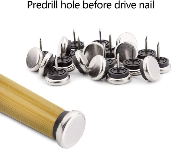 Pre-drill the furniture legs / feet to avoid splitting/splintering issues!The nail is actually a wire brad so it bends easily so hammer lightly.