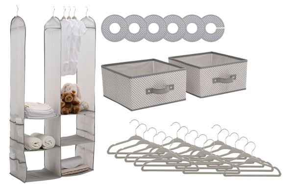 Get your nursery or childs room in tip-top shape with this 24-Piece Nursery Storage Set from Delta Children! A complete closet and bedroom organisation set, it gives you everything you need to straighten up your childs drawers, shelves, closet and dresser. This handy set includes 15 velvet hangers, 6 closest dividers, two small bins, plus a six-shelf hanging organizer. Each item is designed specifically for kid-sized stuff with a durable construction that can handle heavy use. Use the items in this set to for baby clothes, bibs, socks, nappies, toiletries, and other nursery accessories. Purchase this set for your own babys room or as a baby shower gift for someone else.