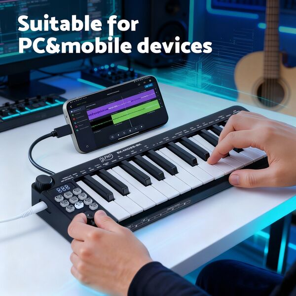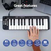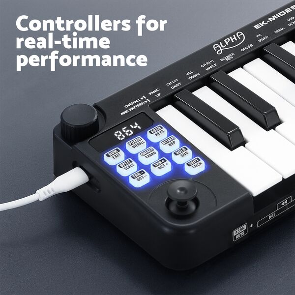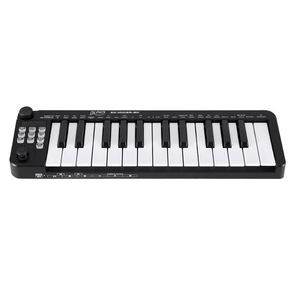 This 25-key portable MIDI keyboard is perfect for music production on the go. Featuring velocity-sensitive keys and a handy keyboard split function, it offers comprehensive control. The assignable knob and joystick enhance real-time performance. Creative features include one-touch chord, intelligent scale, and a built-in MIDI clock. This 25 key MIDI controller includes USB/MIDI combo power, transport control, and a 3-digit LED display. Its compact size (360 x 105 x 35 mm) makes this USB MIDI controller for laptop use an essential tool in Black.