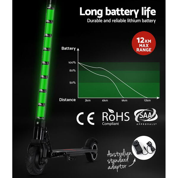 Put the fun back into your journeys with our nimble and fast Electric Scooter. Made of high-grade carbon fibre for the stalk and aluminium for the deck, the electric scooter can carry up to 100kg with total ease. The powerful 250W motor complies strictly with Australian standards and can reach up to max speed of 25km/h. Plus, the durable and reliable 24V lithium battery can power the scooter up to maximum range of 12km. Better still, the LED display lets you monitor a host of parameters including speed, gear mode, lock signal and battery level. Riding the scooter is just as comfortable too with the foamed handle bar while the skid-resistant deck ensures a steady and safe stance with every ride. And when the riding done, you can easily park the scooter standing-up with the strong kickstand for handy convenience. Safe riding is also enhanced by the ultra-bright headlight and a working tail light that lights up in red whenever the brake is applied on the anti-wear and anti-puncture 5” rubber airless tyres. Not least, the lightweight 8kg electric scooter can be folded up in minutes for easy transport or storage.