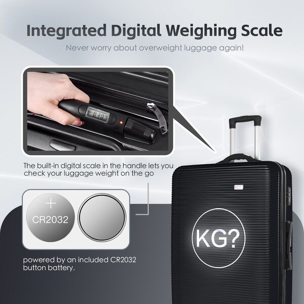 Integrated Digital Weighing Scale: Check your luggage weight on the go with the built-in digital scale in the handle. Powered by a CR2032 button battery (included).
