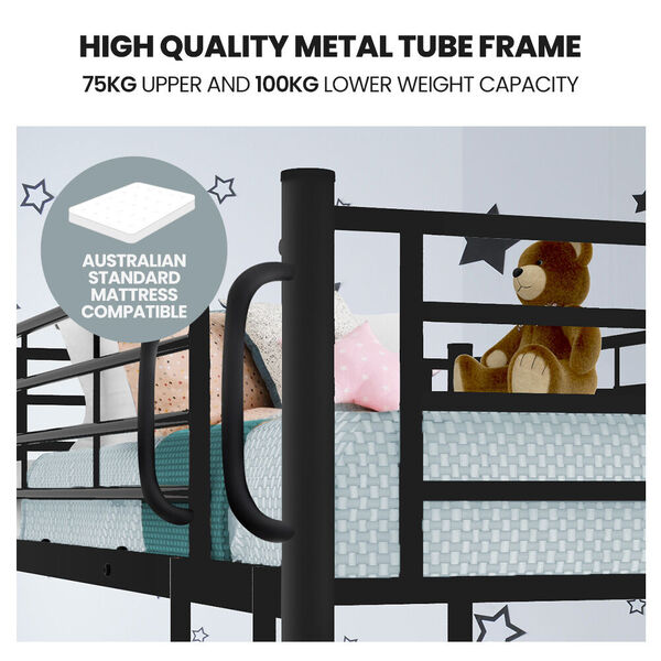 Thanks to its smart convertible design it can be split into two individual single bed framesand with a 75kg upper and 100kg lower capacities it can provide many years of use, as your family grows. It is compatible with standard single sized mattresses and designed and tested to meet stringent Australian standards.