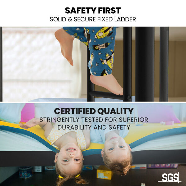 The strong tubular metal frame has a matte dark grey non-rust finish with matching fastenersso this bunk bed not only looks great, but is also built to last! Soft rubber feet ensure that the bed can be placed on any floor type without the risk of scratching. With safety in mind, this bunk bed has no sharp edges and smooth welded joints. It also features a solid and secure fixed ladder that is easy to climb without the wobbles of other less sturdy bunk beds.