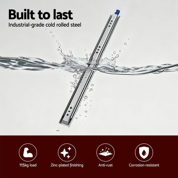 Enhance your storage setup with the Heavy-Duty Drawer Slides, engineered for superior performance and durability. Available in a range of lengths from 750mm to 1500mm, these slides can handle a substantial load of up to 115kg, making them perfect for your toughest projects. Whether it's a UTE toolbox, a camper trailer's storage, or a 4WD cargo system, or household cabinets, these slides provide reliable support. Experience effortless operation with the precision ball bearings, ensuring a smooth and silent glide every time. The integrated nylon buffer design offers a soft and quiet close, while the optimized PP triggers make locking and unlocking simple and safe. Built from thickened zinc-coated cold-rolled steel, these slides are designed for a long lifespan, capable of withstanding over 50,000 opening and closing cycles. The lock-in/lock-out design ensures your drawers stay securely in place on uneven ground. With full extension, you can easily access items at the very back of your drawer, maximising your storage and convenience. Upgrade your drawers with and enjoy a combination of strength, safety, and smooth functionality.