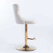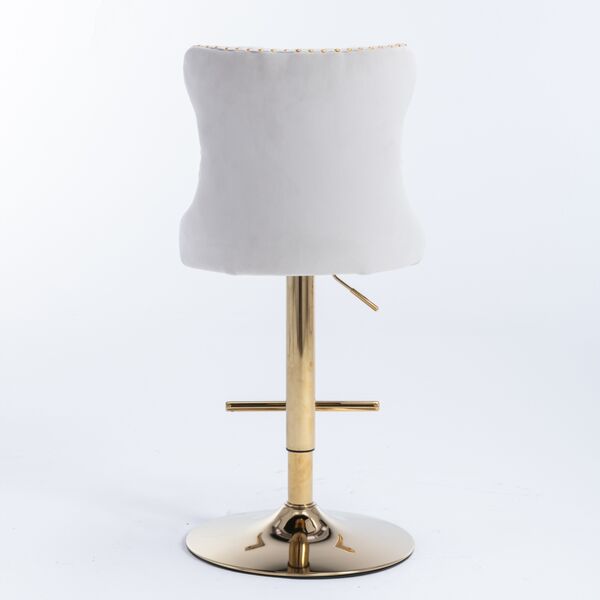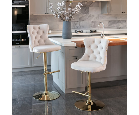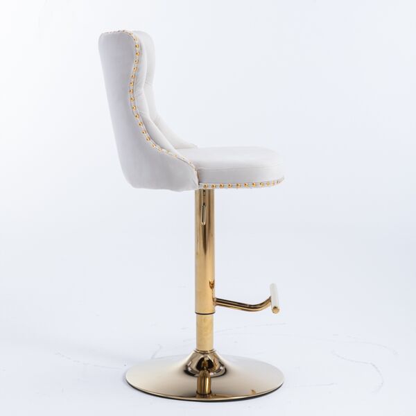 This bar stool features a sturdy golden chromed metal base with a built in 360 swivel function and footrest. A plastic ring is attached to prevent floor from scratching.