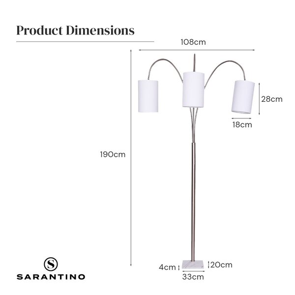 A smart and stylish way to light up a seating area, this 3-arm arc lamp provides overhead lighting that can be controlled with three adjustable shade arms. Aside from functional assets, a brushed steel finish is paired with a white marble base to display striking style.