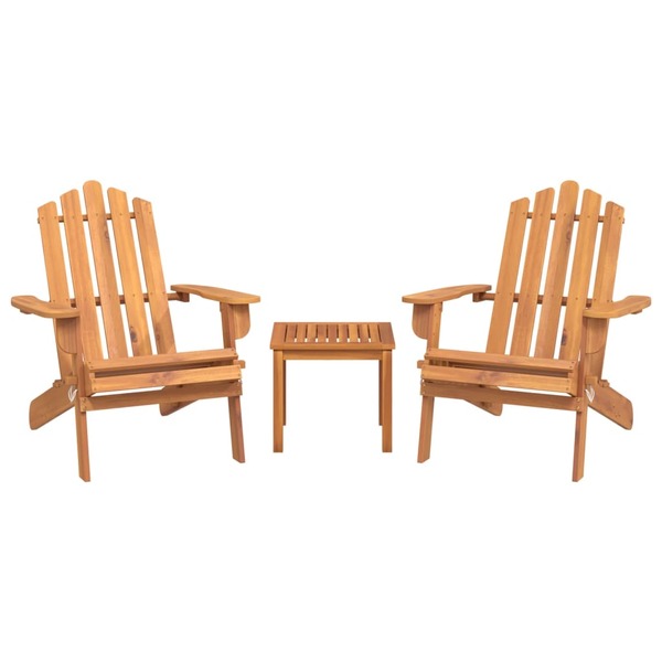 Enjoy your leisure time with this wooden garden lounge set in Adirondack style. Solid acacia wood: This Lounge set is made of solid acacia wood. Solid acacia wood is a beautiful natural material. Acacia wood is a tropical hardwood, which is dense, sturdy, and durable.Comfortable seat experience: The high, slightly inclined backrest and wide armrests allow you to sit back comfortably while relaxing.Practical table: The coffee table is perfect for placing your drinks, food and other decorative items.Foldable design: The Adirondack chair can be easily folded away when not in use, for easy storage and transportation. Good to know:To make assembly as easy as possible, each product is delivered with a manual. Note:To make sure your outdoor furniture stays beautiful, we recommend protecting it with a waterproof cover.
