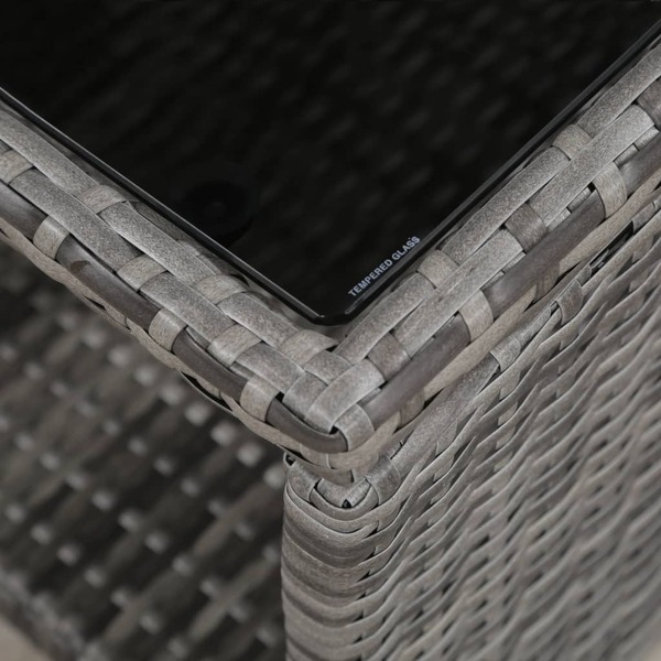 - Material: PE rattan + powder-coated steel frame + glass tabletop