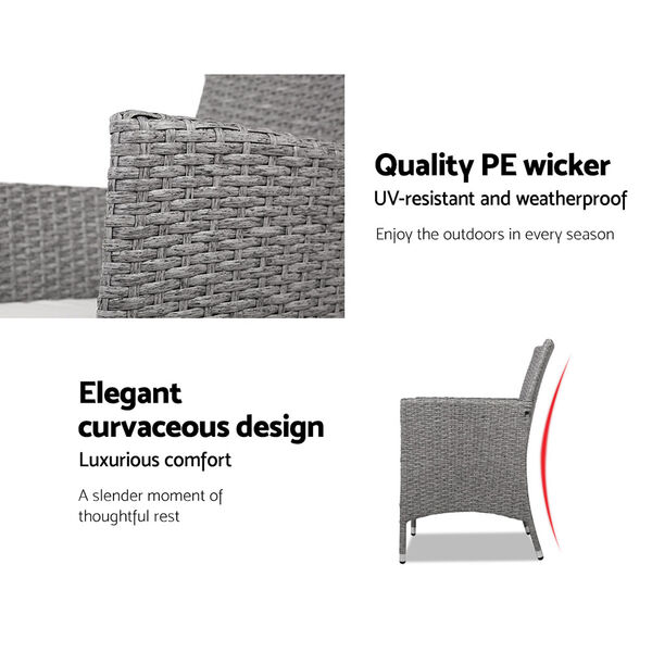 Comprising two ample size sofas with elegant curvaceous designs and a matching glass top side table, our Outdoor Set certainly adds a premium look to your yard or deck. The dark-stained PE Wicker is UV-resistant and weather-resistant to ensure that it retains its deep lustre through years of outdoor use under the elements. The frame itself is made of sturdy steel powder coated for durability and has rubber-protected legs to keep scratches off your deck.