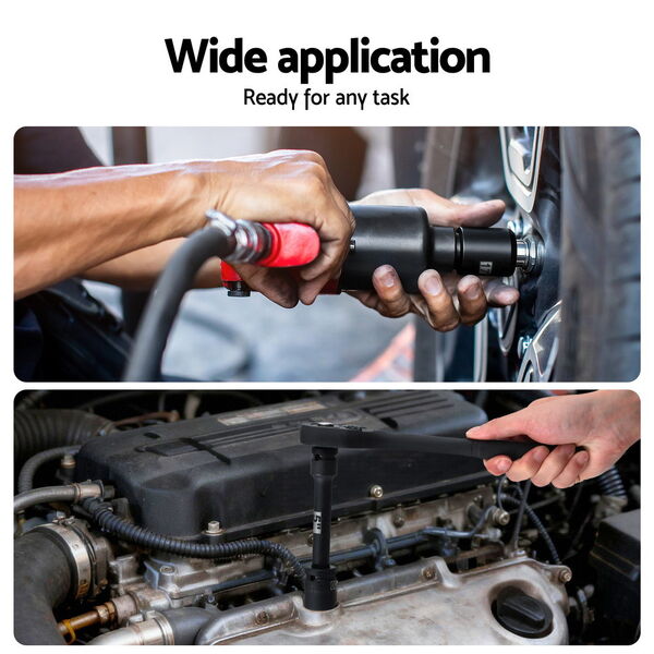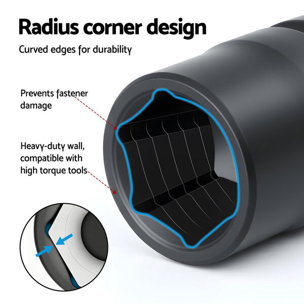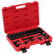 The kit includes 6-point (8每32mm) and 12-point (10每19mm) sockets, compatible with standard 1/2" ratchets, breaker bars, and power tools. Precision-machined design grips flat sides of fasteners, reducing slip and rounding-off
