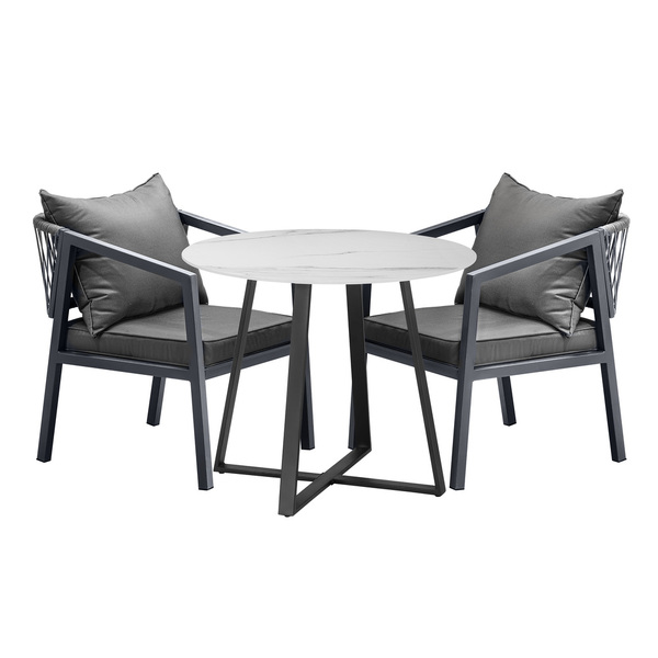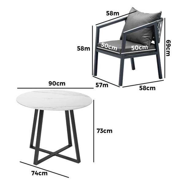 The set includes a nice round table and comfortable chairs, creating an inviting and functional outdoor dining area. The table provides ample room for serving meals, playing games, or simply enjoying drinks with friends and family. Its sturdy construction ensures stability, while the sintered stone tabletop surface makes cleaning a breeze.