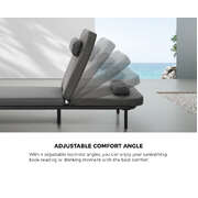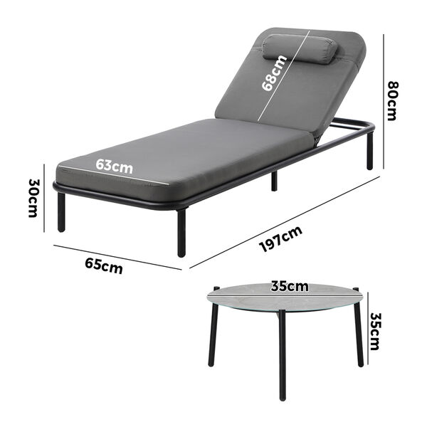 Nothing beats having a great lounge to chill out and relax. Cue in the Sun Lounge Set. With its 3-piece configuration of two sun lounges and one matching coffee table, the sun lounge set is the epitome of stylish relaxation with the best possible combination. With its wide and generous proportions, the sun lounge will always feel and seemed like a lot more. Wrapped in a durable and water-resistant polyester fabric cover that is removable, the elegant sun lounge is simply luxurious in form and function and made for hassle-free maintenance. Comfort is enhanced with a 7cm thick cushioning that feels simply wonderful. And equipped with four adjustable positions for the backrest, you can turn your sun lounge into the best seat in the house for watching TV, reading, or keeping up with your social media, or nestle it down for relaxation, napping or sleeping. Outdoors or indoors. Plus, with its glassy marble-like 5mm thick tabletop, the matching coffee table signifies an intention to up the elegant factor while enjoying your tete-a-tete with friends and family over drinks and snacks, or simply appreciating its captivating presence in your home. Beyond aesthetics, the versatile sun lounge set is built to exacting standards. The workmanship is meticulous with near-flawless finishing and close attention to details. Likewise, the three-legged profile of the coffee table is unique in stature with a powder-coated steel construction.Simply amazing and pleasing to the senses from every angle. Perfect for indoors or outdoors use. Get your Sun Lounge Set today.