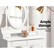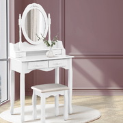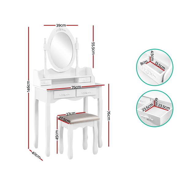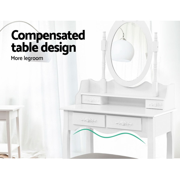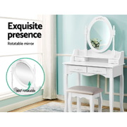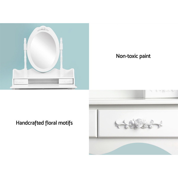 Add a touch of Provincial charm to your bedroom with our luxurious period style Artiss Dressing Table Set. Graceful and elegant, the set exudes finesse in every corner and aspect. Much like yourself as you prepare for the day in alluring beauty. Made with meticulous craftsmanship, the dressing table features lovely floral embellishments all over, large mirror and four detailed drawers that provide ample storage space for your jewellery pieces and makeup essentials. It also features a compensated table design that allows more leg room for seating comfort. Plus, the mirror rotates 360° so that you can admire your reflection from any angle. And the piece de resistance must be the beautifully embroidered padded stool that is no less a work of passionate furniture making. Together, the ensemble is immediately captivating to the senses.