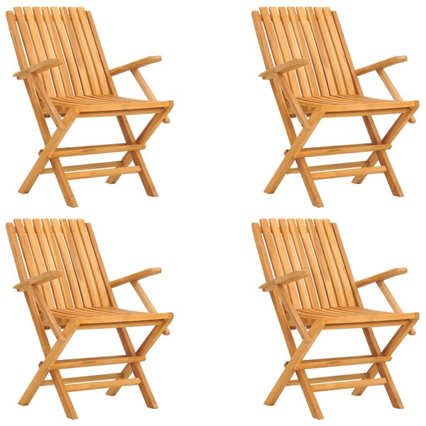 Enjoy a cosy leisure time with your family and friends in your outdoor space on these wooden folding garden chairs! Solid teak wood: Solid teak wood is a beautiful natural material. It has been seasoned, kiln dried and then fine sanded to give a very smooth appearance. Teak wood is known for its exceptional strength and weather resistance.Foldable function: The garden chair can be folded away to save space when not in use.Comfortable experience: The backrest and armrests of the garden seating give you excellent support, providing an optimal comfortable experience.Slatted design: The outdoor chair with a slatted design looks simple and timeless. Note:To make sure your outdoor furniture stays beautiful, we recommend protecting it with a waterproof cover.Good to know:To make assembly as easy as possible, each product is delivered with a manual.