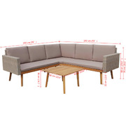 This garden sofa set will make a great addition to your outdoor living space. It will add a touch of modern elegance to your patio, balcony or garden with its understated, yet stylish design. The easy-to-clean and hardwearing garden furniture set is made of weather-resistant and waterproof PE rattan, making it suitable for daily outdoor use. The oil-finished wooden frame makes the set very sturdy and durable. This set is delivered with highly comfortable, thickly padded seat cushions and back cushions. The covers are equipped with zips and are washable. Delivery includes 1 corner sofa, 2 two-seater sofas, 1 coffee table, with 6 back cushions and 3 seat cushions. Note: We recommend covering the set in the rain, snow and frost.
