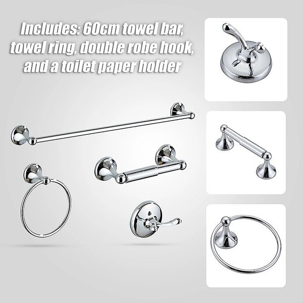 - Includes: 60cm towel bar, towel ring, double robe hook, and a toilet paper holder