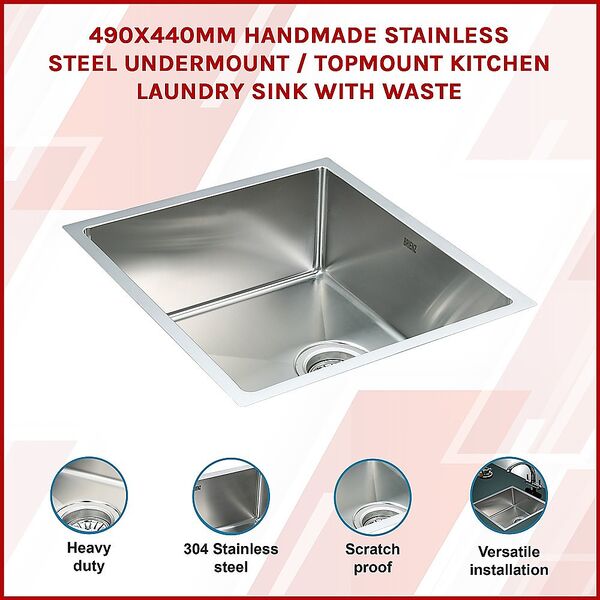 490x440mm Handmade Stainless Steel Kitchen/Laundry Sink with Waste