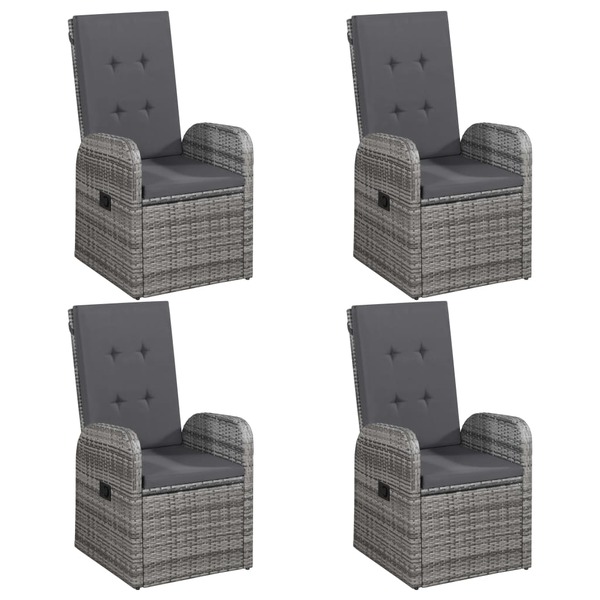 Create a compelling and cohesive aesthetic in your outdoor space with this garden dining set! The dinner table is made of solid acacia wood with an oil finish, which makes it stable, durable and easy to maintain. Featuring a powder-coated steel frame covered with weather-resistant PE rattan, these dining chairs are sturdy and easy to clean. The backrest will recline by pulling the button on the side. Thanks to the lightweight construction, the chairs are easy to move. It is also delivered with highly comfortable, thickly-padded cushions for the ultimate comfort. The low-maintenance polyester covers can also be removed and washed. Important note: We recommend covering the dining set during rain, snow and frost for its best service to last.
