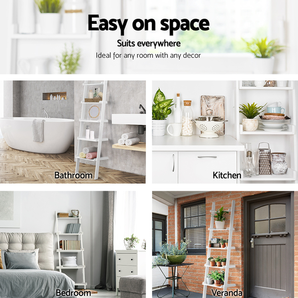 Suitable for different rooms - Bathroom, bedroom, living room and even your balcony, this 5 tier wall ladder shelf can store things tidily and easy to look for. It's also a good way for displaying your photos and books that you have read. It's great to have them side by side too.