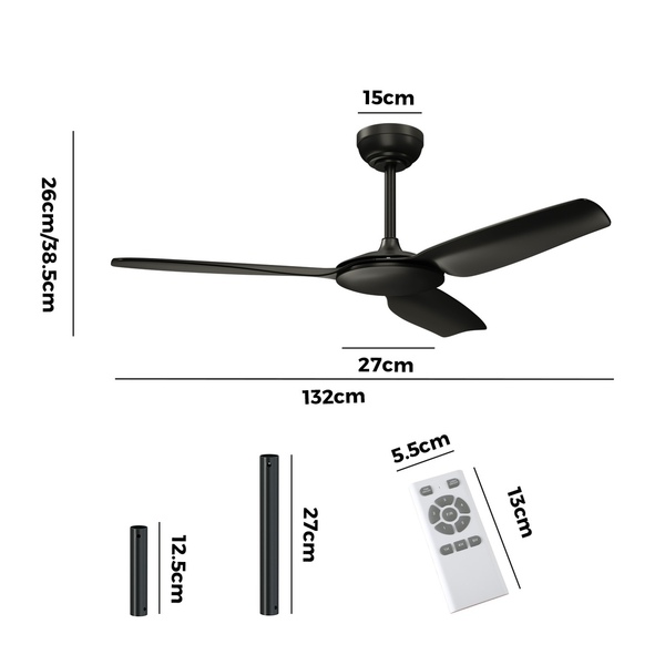 52'' Ceiling Fan DC Motor 3 ABS Blades with Remote Control Timer Black