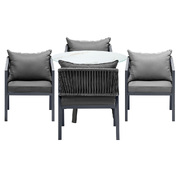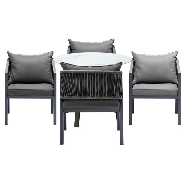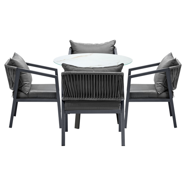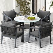 Living life to the fullest. Chilling out under the sun, moon and stars. Alfresco dining with friends, family or just with your precious me-time. Simply pursuing and enjoying life that is meant to be. And the Outdoor Dining Set is ready to be there at home with you. Stylish. Contemporary. Beautiful. For the dining table, a white ceramic tempered glass top with handy storage shelf beneath. And for the dining chairs, equally attractive pieces that go well with the table. The set has all the attributes of chic outdoor furniture that resonate with your discerning lifestyle. Have your lattes, your favourite brews and savour delectable cuisines and other gastronomical delights. Eat, drink and be merry! But how does the dining set stand up to the harsh and sometimes fickle Australian weather? No worries mate as it is all weather-resistant, chairs and table, with strength and durability for robust use. Not least, this dining setup also looks fabulous with any indoor eclectic styling ideas that you may have. Convinced that this delightful outdoor package is for you? Click on the Buy option and soon you will be feasting to your (and many others too) heart's content at the Outdoor Dining Set day and night, night and day, in every season.