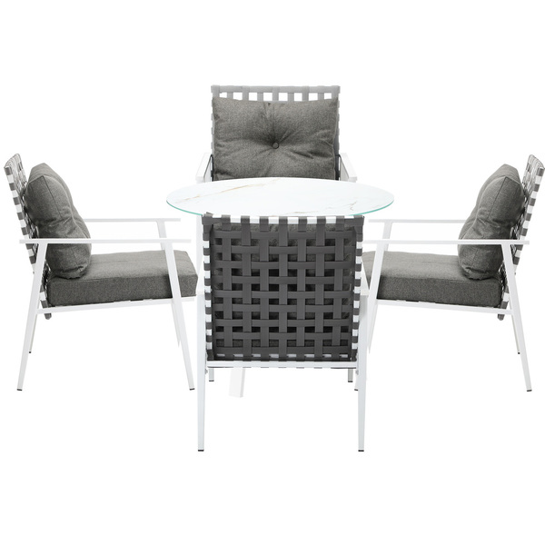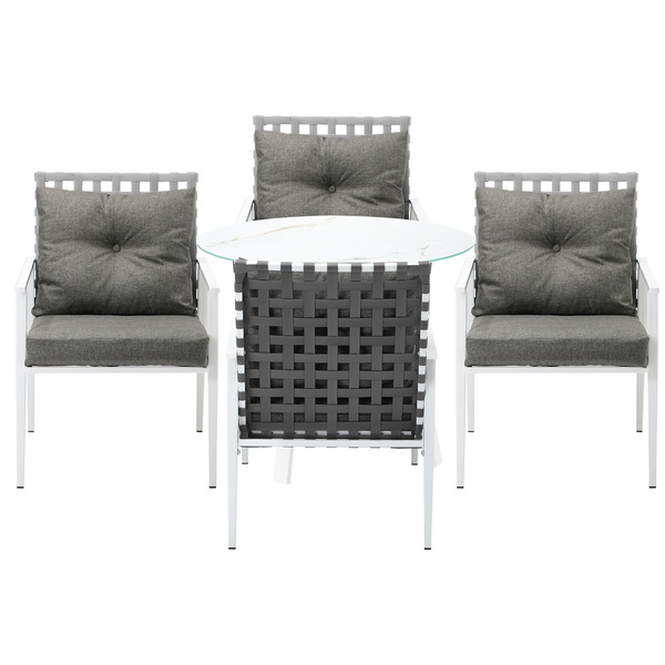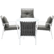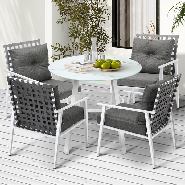 Living life to the fullest. Chilling out under the sun, moon and stars. Alfresco dining with friends, family or just with your precious me-time. Simply pursuing and enjoying life that is meant to be. And the Outdoor Dining Set is ready to be there at home with you. Stylish. Contemporary. Beautiful. For the dining table, a white ceramic tempered glass top with handy storage shelf beneath. And for the dining chairs, equally attractive pieces that go well with the table. The set has all the attributes of chic outdoor furniture that resonate with your discerning lifestyle. Have your lattes, your favourite brews and savour delectable cuisines and other gastronomical delights. Eat, drink and be merry! But how does the dining set stand up to the harsh and sometimes fickle Australian weather? No worries mate as it is all weather-resistant, chairs and table, with strength and durability for robust use. Not least, this dining setup also looks fabulous with any indoor eclectic styling ideas that you may have. Convinced that this delightful outdoor package is for you? Click on the Buy option and soon you will be feasting to your (and many others too) heart's content at the Outdoor Dining Set day and night, night and day, in every season.