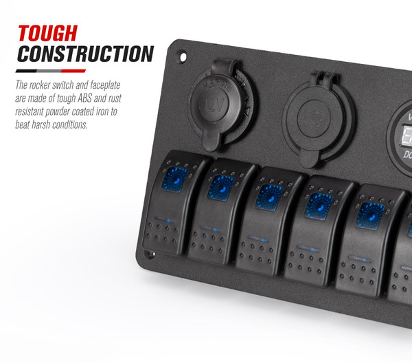 Tough Construction: The rocker switch and faceplate are made of tough ABS and rust resistant powder coated iron to beat harsh conditions.