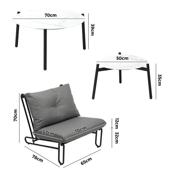 For the single chairs, thick and wide seat and tufted backrest cushions are matched with a unique black powder-coated steel frame for a classy and sophisticated look that transcends time and space. Likewise, with its stone-composite finish for the table top and black powder-coated metal legs, the nesting table adds even more elegance to the entire outdoor ensemble. As a whole, the sofa set is finished with meticulous attention to details and committed workmanship.