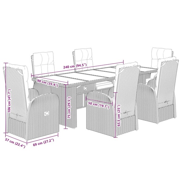 This garden dining set is a great choice for al fresco dining or just relaxing in the garden, backyard, or on the patio. Durable material: PE rattan, also known as poly rattan, is a strong, low-maintenance synthetic material that looks like natural rattan. It's lightweight, easy to clean, and commonly used for outdoor furniture due to its durability and weather-resistant properties.Adjustable backrest and footrest: This garden seat has a handle. You can adjust the backrest and footrest to any position by pulling the handle, and quickly return it to its original position.Comfortable seat experience: This outdoor furniture, complete with thickly padded cushions, offers a comfortable seating experience.Removable and washable cover: These seat cushions feature removable covers for easy washing and maintenance.Stable and easy-to-clean tabletop: This garden table has an acacia wood top that is sturdy, durable, and easy to clean with a damp cloth. Good to know:To make sure your outdoor furniture stays beautiful, we recommend protecting it with a waterproof cover.