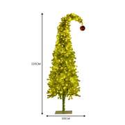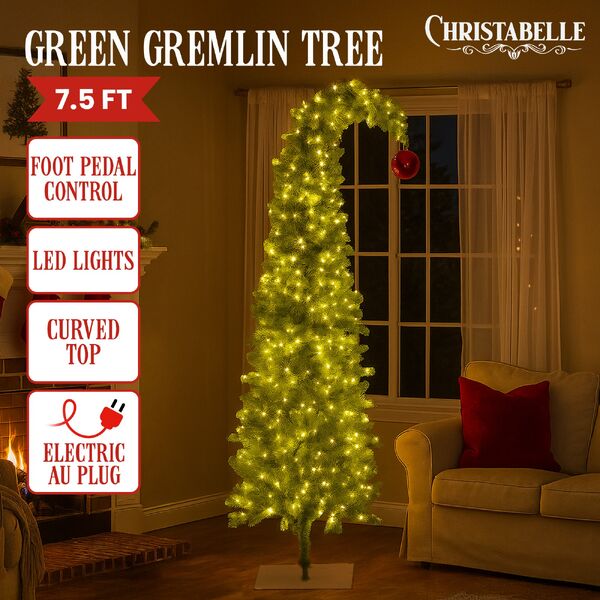 Who let the Gremlin tree in? This quirky Christmas tree brings playful mischief to your festive setup. Standing at 7.5 feet tall (229cm), it features a curved top with a bold red bauble, built-in green and white lights controlled by a foot pedal and a matching green base and cord.