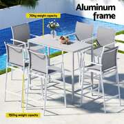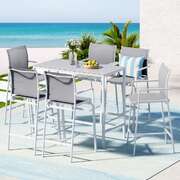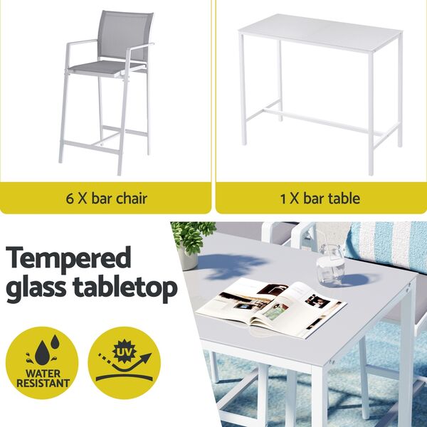 Elevate your outdoor living with 's complete 7-piece bar set (1 table + 6 stools). The powder-coated steel frames and tempered glass tabletop combine durability with modern elegance, perfect for all-weather use. Enjoy exceptional comfort with high-back stools featuring breathable fabric seats and built-in footrests. The space-saving design tucks neatly under the table when not in use. Non-slip feet ensure stability on any surface. Ideal for poolside entertaining, garden parties or balcony dining, this rust-resistant set comfortably seats 6. Quick assembly and weatherproof materials make it a stylish, long-lasting outdoor solution.