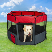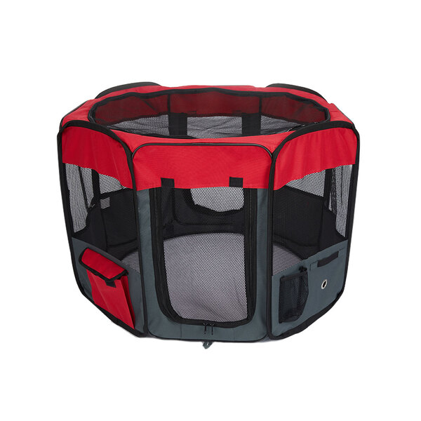 Made of high-quality 600D Polyester. Built tough and strong to withstand all those darnedest tantrums. Its polyester construction provides a wide range of advantages such as excellent water, scratch, and fade resistance. It comprises of durable mesh window with two inbuilt doors for better ventilation. The upper surface of the playpen is equipped with mesh for a comprehensive view of the surroundings and added safety. Store all your pet’s drinks and snacks - It also comes with a side pocket, mesh pouch, and elastic strap. Use its roll-up zipper to open and close the doors, provided with a double zipper for added security. Very easy to install, suitable for indoor and outdoor use.