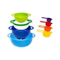 Super Smart Compact Stackable 8 Piece Kitchen Food Prep Mixing Bowls and Measuring Spoons Nesting Set. This Essential all-in-1 Kitchen Saver Pack includes a 10 Large Mixing Salad Bowl 8.5" Colander 7.5" Sieve Sifter Strainer 5.75" Medium Bowl with Spout 200ml Measuring cup 150ml Measuring Cup 100ml Measuring Cup and a 50ml Measuring Cup. Winning Features: Super smart compact space saving smart storage kitchen set Includes everything you need for baking cooking food prep and more Accurate measuring guides for following recipes Dishwasher-safe - so no stress washing up Bright colourful kit for easy organisation The perfect gift for people moving into their apartments What's Included: Large mixing bowl: 10" Straining Colander: 8.5" Sieve Strainer: 7.5" Small mixing Bowl: 5.75" Measuring cups: 200/150/50ml Materials: 100% BPA Food-Grade FDA Approved ABS Weight: 832 g / 29.3 oz Package Include: 8 PCS / 1 SET Smart new innovative design allows all parts to be stacked neatly together to occupy the absolute minimum amount of space "