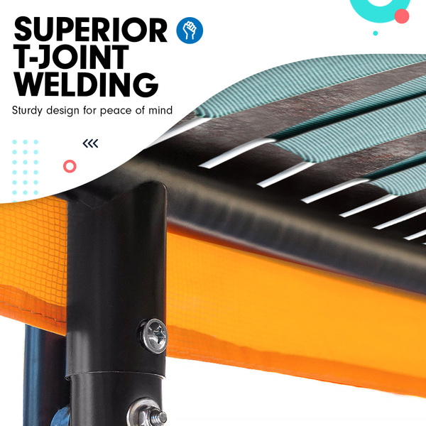 Springless design: Rather than using steel springs, this innovative design uses super-responsive, wide elastic straps all the way around the mat to provide the bounce in a safe springless jumping area.