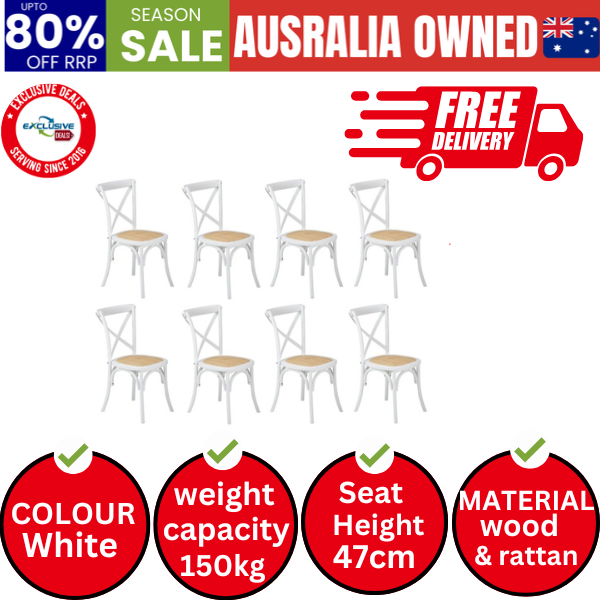 8PCS Crossback Dining Chair Solid Birch Timber Wood Ratan Seat White