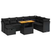 9 Piece Garden Sofa Set with Cushions Black Poly Rattan Acacia - Sleek