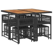 This garden dining set is a great choice for al fresco dining or just relaxing in the garden, backyard, or on the patio. Durable material: PE rattan, also known as poly rattan, is a strong, low-maintenance synthetic material that looks like natural rattan. It's lightweight, easy to clean, and commonly used for outdoor furniture due to its durability and weather-resistant properties.Compact storage: These chairs have a flap backrest that can be folded down, making it easy to store them under the table. When folded, they neatly fit under the table, forming a space-saving cube shape. Additionally, the stools can also be stored under the chairs, further maximizing space efficiency.Comfortable seat experience: This outdoor furniture, complete with thickly padded cushions, offers a comfortable seating experience.Removable and washable cover: These seat cushions feature removable covers for easy washing and maintenance. The cushion covers have a flap at the back for easy attachment to the backrests.Stable and easy-to-clean tabletop: This garden table has an acacia wood top that is sturdy, durable, and easy to clean with a damp cloth. Good to know:To make sure your outdoor furniture stays beautiful, we recommend protecting it with a waterproof cover.
