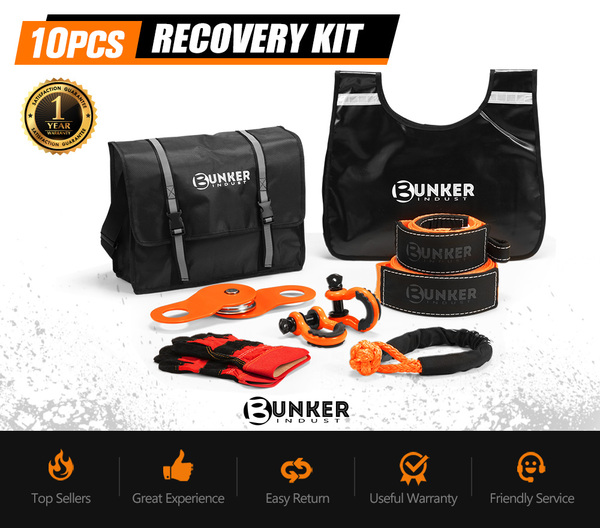 Comprehensiveness: The BUNKER INDUST recovery kit is complete with everything: from snatch straps, shackles, gloves and winch dampener to snatch block.