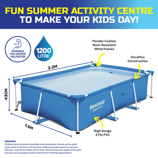 Bestway Boasting high quality, durable 3 ply PVC polyester material and powder coated rust resistant metal frames, this robust structure is 2.2 metres long, holding 1200 litres. Sure to be a favourite activity this summer, enjoy splashing about and relaxing in your own surroundings in this above ground pool.