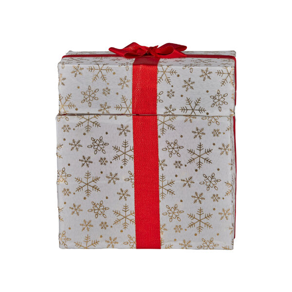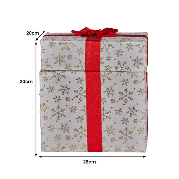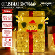 Add frosty fun to your holiday display with this animated white gift box. The lid lifts to reveal a jolly snowman popping up with festive cheer, while warm white LED lights cast a cosy glow. Perfect for brightening indoor spaces or covered outdoor areas, this playful decoration brings movement, light and a dash of winter magic to your Christmas celebrations.