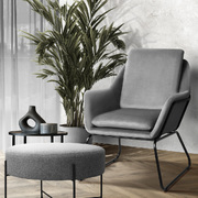 Built to complement your home in more ways than one, the armchair is superbly crafted with a sturdy frame, fully upholstered with soft velvet, a generously padded seat and backrest , numerous fine details for lasting durability and support. An outstanding design feature, the one-piece powder coating metal armrests and front legs construction offers a seamless connect that characterises its unique structure.
