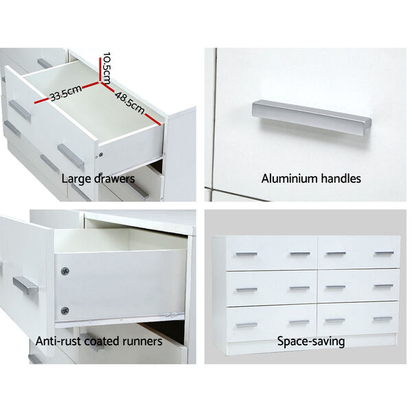 Practical and handsome, our 6-drawer Lowboy is perfect for those looking for extra storage space for your home. Contemporary and simply designed, this beauty features a flawless melamine finish with elegant handles that will easily match your home d��cor. Made with premium 15mm thick particle board with anti-rust coated drawer runners, our lowboy works ever so smoothly with minimum hassle. Not least, it provides plenty of storage space with six generous-sized drawers for all your clothing, fashion essentials and more.
