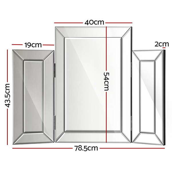 Enjoy all the glitz and glamour that comes with our Artiss Tri-fold mirror. Cladded with bevelled mirror glass and made of durable E1 grade MDF board, the elegant mirror is simply stunning from any angle that reflects its mirrored beauty. Match with the mirror console table and mirror stool and place at your entryway to make a grand entrance to wow your guests. Or place in your bedroom where the ensemble transforms into a dressing table. Wherever you place it, the mirrored effect gives the room a larger-than-life look of space and size. The mirror is 2cm thick and comes with safety brackets included, meaning you can continue to admire your reflection well into the future. The side mirrors fold 180° so that you can completely fold and close the mirror when not in use. Easy to maintain and clean, our folding mirror is all about grandeur living made simple.